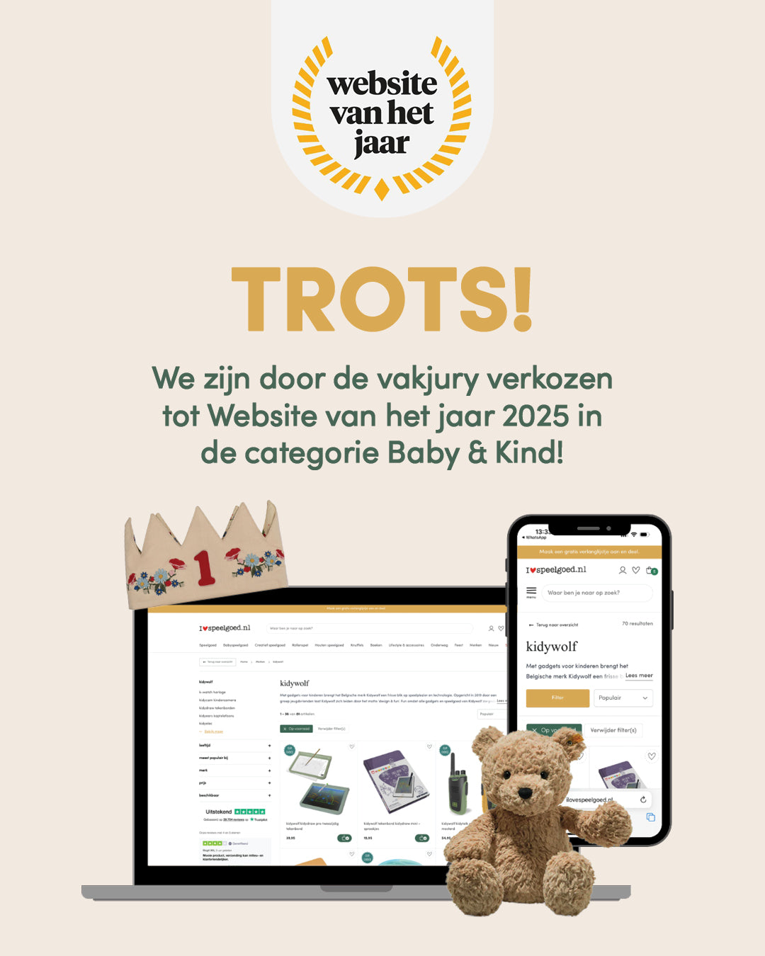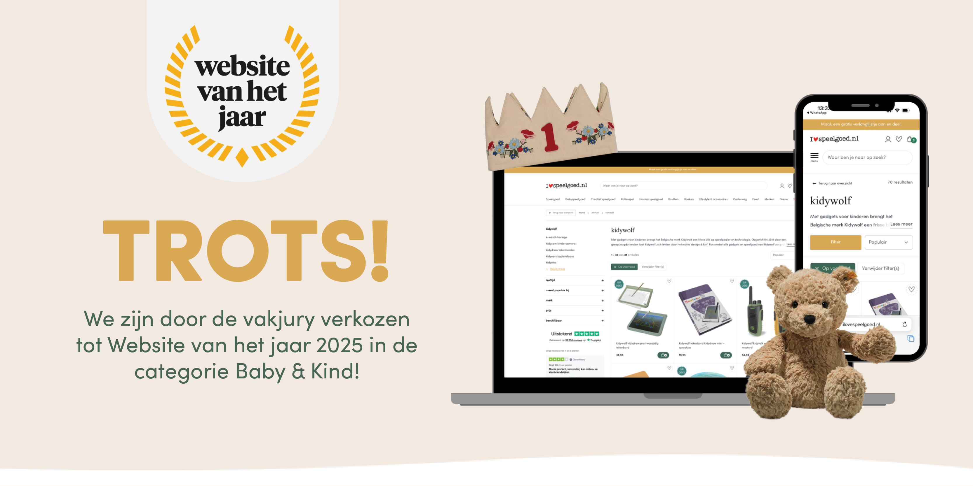ilovespeelgoed is door de vakjury uitgeroepen tot Website van het Jaar in de categorie Baby & Kind. Daar zijn we heel blij mee! Een erkenning door experts die precies weten waar een goede website aan moet voldoen. Dat maakt deze waardering extra bijzonder.