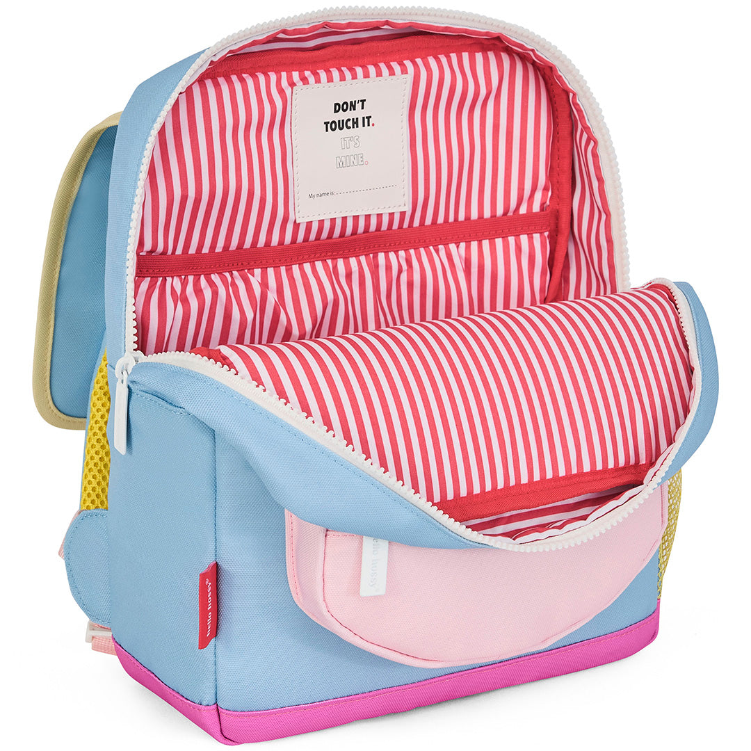 De kleurrijke rugzak heeft verschillende compartimenten en vakken, zodat je gemakkelijk alle spullen georganiseerd houdt. Stop de schriftjes, broodtrommel en etui in het grote vak en sluit het netjes af met de ritssluiting. Aan de voorkant van de tas vind je een zachtroze voorvakje om kleine spulletjes in op te bergen. De waterfles kun je gemakkelijk opbergen in het vakje aan de zijkant zodat je er altijd bijkomt! Ideaal voor de snelle dorst onderweg.