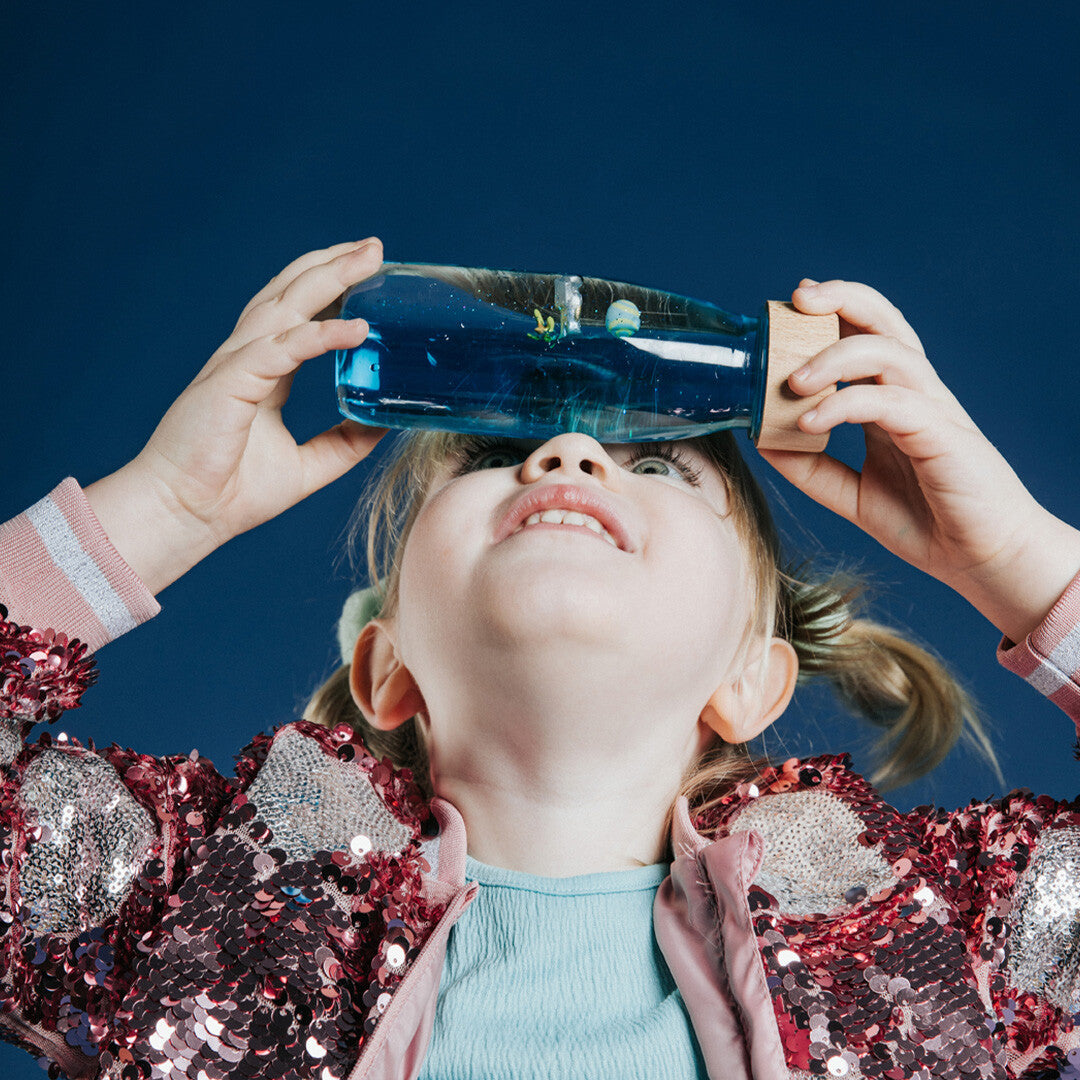 Klaar voor een spectaculaire ruimtereis? Kleur, beweging en het ontdekken van het universum komen samen in de sensorische fles 'Move Bottle Universe' van het Spaanse merk Petit Boum. Beweeg de sensorische fles heen en weer en zie hoe de sterren zich door de fles verspreiden terwijl de astronaut de ruimte verkent.