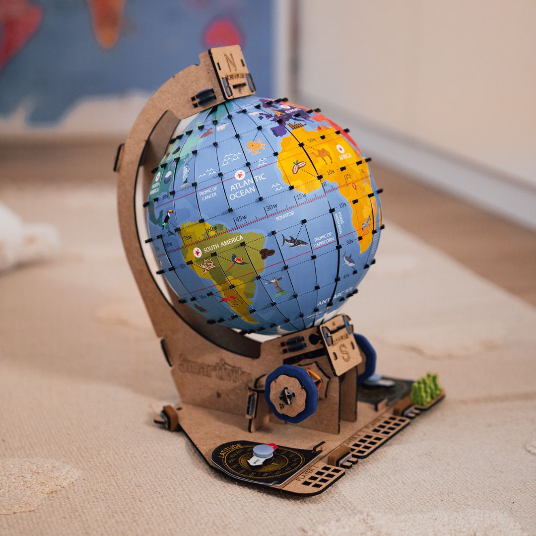Al lerend over de aarde een wereldbol bouwen? Dat kan met de 'Globetrotters' bouwset uit de collectie Smartivity van het Belgische merk Smart Games. De kleurrijke wereldbol leert de kleine slimmerik spelenderwijs verschillende aspecten van aardrijkskunde, zoals hoofdrichtingen en geografische coördinaten.