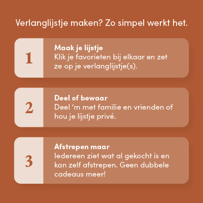 Kies je favorieten, deel je lijstje met familie en vrienden en laat hen afstrepen wat ze geven. Nooit meer dubbele cadeaus, wel precies wat je wilt. Met meer dan 25.000 artikelen is jouw lijstje zo gevuld. En het mooiste: je kunt er zoveel maken als je wilt.